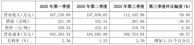 从财务数据来看,山煤国际2025年第三季度及前三季度经营业绩面临较大压力。财报披露,第三季度,公司实现营业收入56.73亿元,同比下降28.27%;归母净利润3.91亿元,同比大幅下滑50.53%,基本每股收益0.20元/股,同比降幅亦达50%。