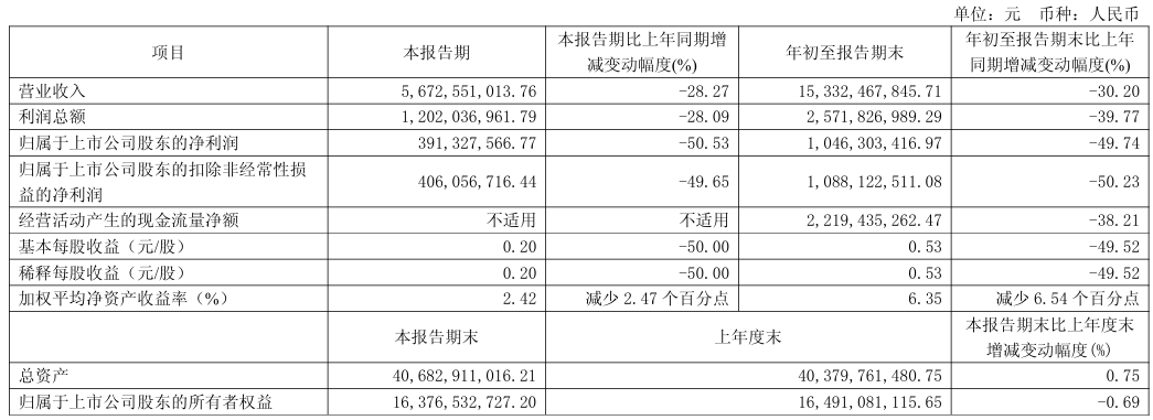 前三季度,业绩承压态势更为明显。据报告内容,山煤国际累计实现营业收入153.32亿元,同比减少30.20%;利润总额25.72亿元,同比下降39.77%;归母净利润10.46亿元,同比降幅49.74%,扣非归母净利润10.88亿元,同比下降50.23%,加权平均净资产收益率6.35%,较上年同期减少6.54个百分点。